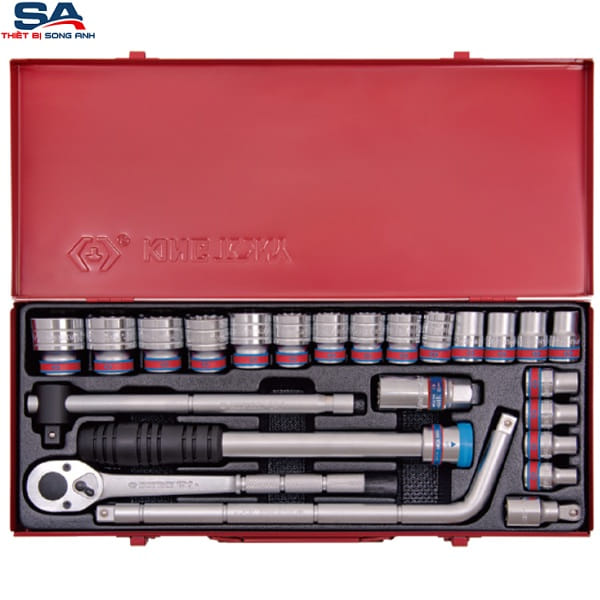 - Bộ sản phẩm bao gồm 24 chi tiết, các loại khẩu (tuýp) 6 cạnh với dải kích thước từ 5/16" đến 1-1/4", cùng với các phụ kiện như cần siết đảo chiều, cần nối, v.v..