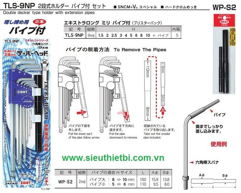 Bộ lục giác EIGHT TLS-9NP được sản xuất tại Nhật, với 9 cỡ lục giác bi từ 1.5 đến 10mm