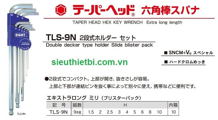 Bộ lục giác EIGHT được sản xuất tại Nhật, với đầu bi được thiết kế tăng khả năng tiếp xúc, đây là thiết kế kiểu "TAPER HEAD"