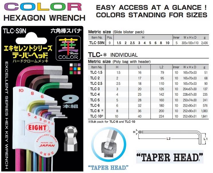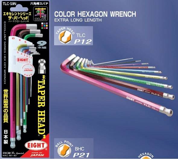 Bộ lục giác EIGHT với màu thể hiện cho từng cỡ TLC-S9N được sản xuất tại Nhật.