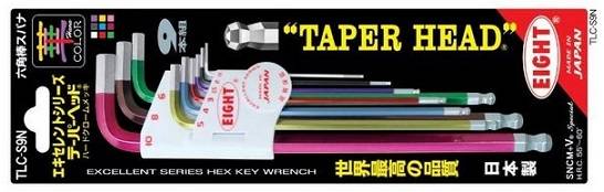 | Bộ lục giác EIGHT được sản xuất tại Nhật, với đầu bi được thiết kế tăng khả năng tiếp xúc, đây là thiết kế kiểu "TAPER HEAD". |