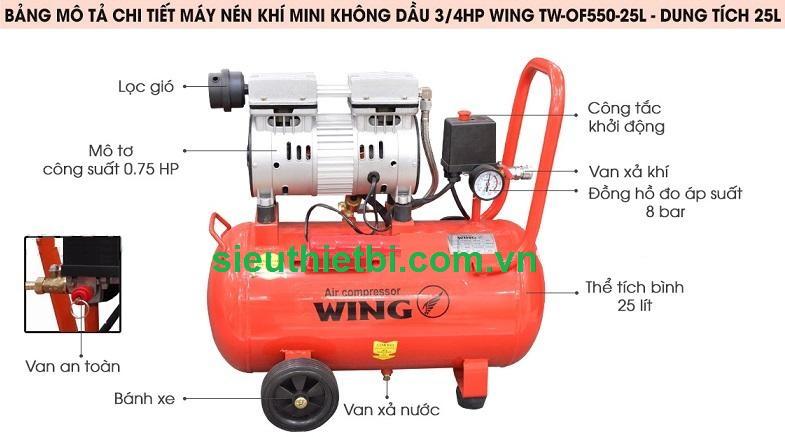 Chi tiết máy nén khí mini không dầu 3/4HP Wing TW-OF550-25L - Dung tích 25L