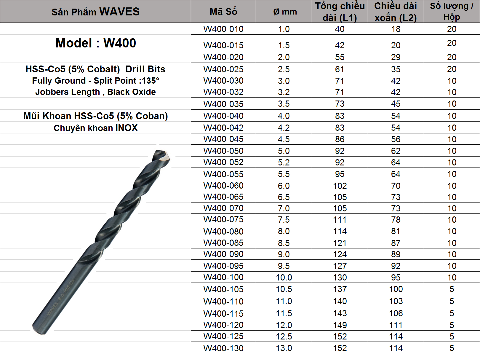 Mũi khoan inox sắt WAVES được chế tạo từ thép gió HSSE Co5 chứa 5% cobalt, chuyên khoan các kim loại cứng như : Inox 201, inox 304, sắt thép hợp kim..