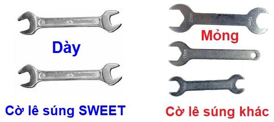 - Máy đi kèm 2 cái cờ lê chuyên dụng dùng để mở thay thế đầu rút size khác, cờ lê hàng chính hãng SWEET rất dày độ chính xác cao khi siết mở ốc vít để thay đầu không bị hư bulong, cờ lê của các loại máy khác rất mỏng độ mở rộng hơn rất khó mở hay làm hư bulong.