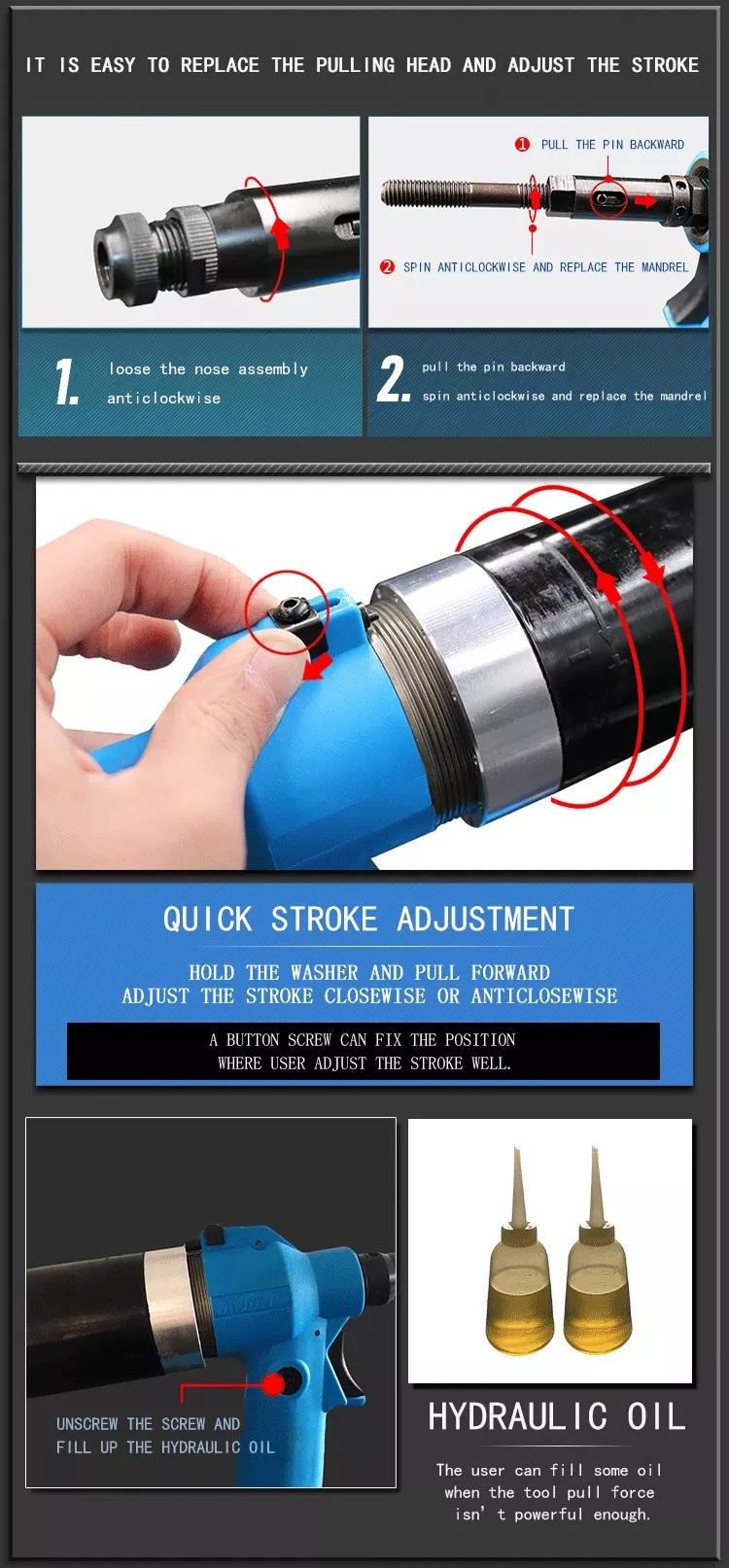 - Lực rút mạnh, hành trình rút dài chuyên dùng bắn ốc tán lục giác có độ cứng cao, ốc tán inox, ốc tán thép, đinh tán nhôm...