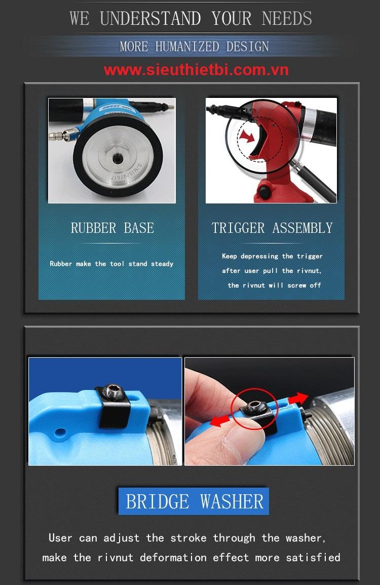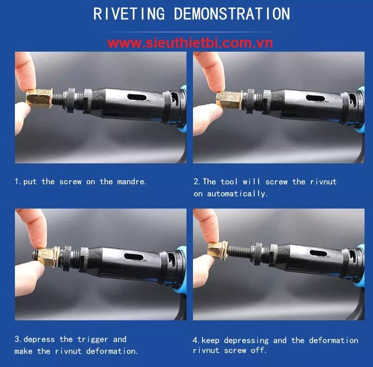 - Lấy ốc tự động, chỉ bóp cò 1 lần máy rút và tự động trả ngược quay ra giúp bạn hoàn thành 1 thao tác rất nhanh hiệu quả cho công việc, tiết kiệm nhân công tiết kiệm chi phí.