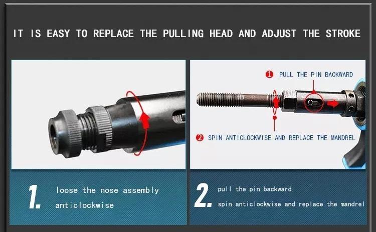 - Lực rút mạnh, hành trình rút dài chuyên dùng bắn ốc tán lục giác có độ cứng cao, ốc tán inox, ốc tán thép, đinh tán nhôm...